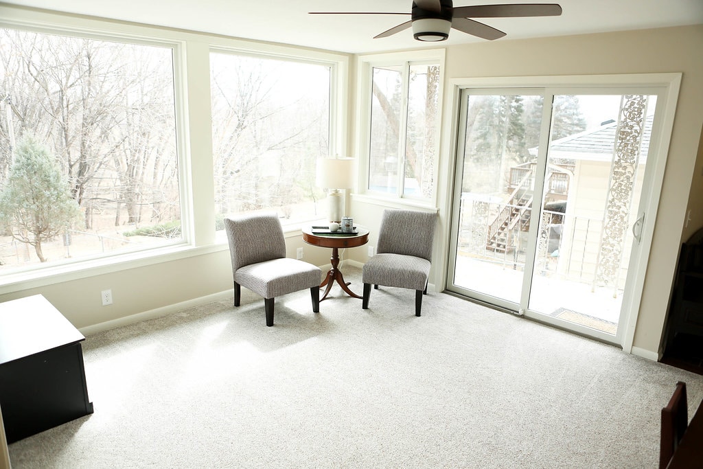 Again, this room was completely gutted as insulation was needed. The team built out a small mudroom connected to the living space that had tile floors and a door leading directly to the garage. They replaced windows on that same wall with a sliding glass door in order to give access to the patio and backyard. The clients had hoped to keep some of the very large, existing windows, but since they were not double-paned, they chose to replace them with the same-sized, fixed, double-pane windows that overlooked the woods in their backyard. The team added sliding windows on opposite sides of the room in order to still allow for a breeze when needed. The team then took out the small door leading to the dining room/kitchen and replaced it with a 6-foot opening and 6-foot custom steps that matched the original wood floors throughout the home. The client chose a durable, speckled gray carpet and Benjamin Moore’s Edgecombe Gray for the walls in order to keep the room bright and consistent with the rest of the home. This space is now used as a playroom and sitting area for the family.
